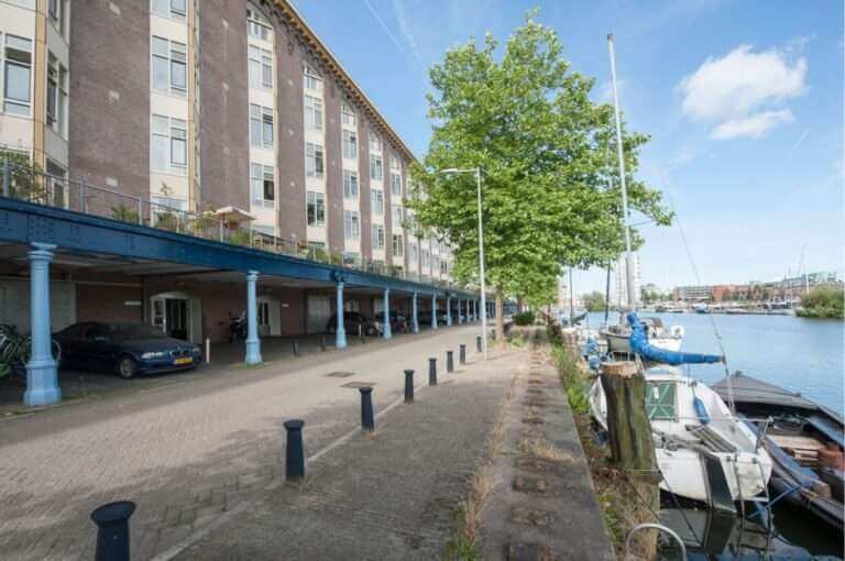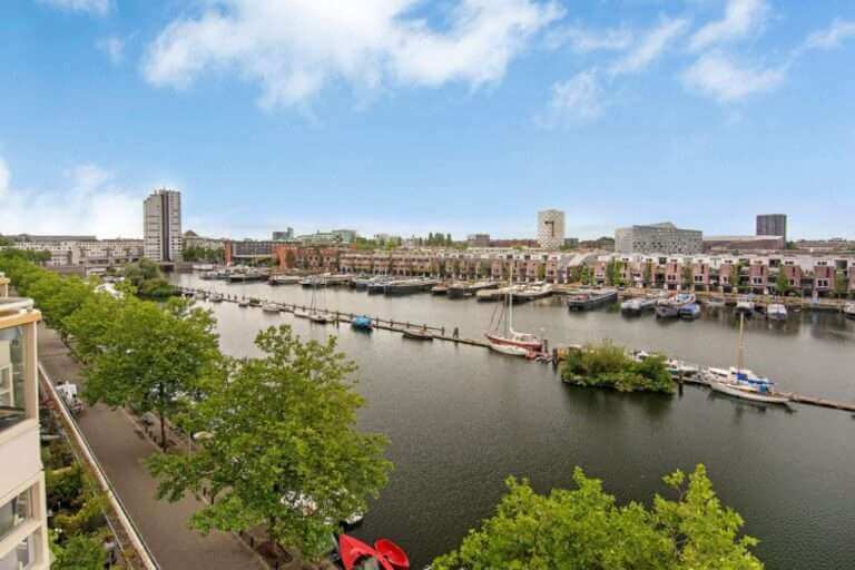 Uniek en schitterend loftachtige maisonnettewoning verdeeld over de bovenste vierde en vijfde verdieping (geen bovenburen) met dakterrasje op het zuiden en aan de voorzijde een balkon aan het water met een prachtig uitzicht over de Entrepothaven in het Oostelijk havengebied!