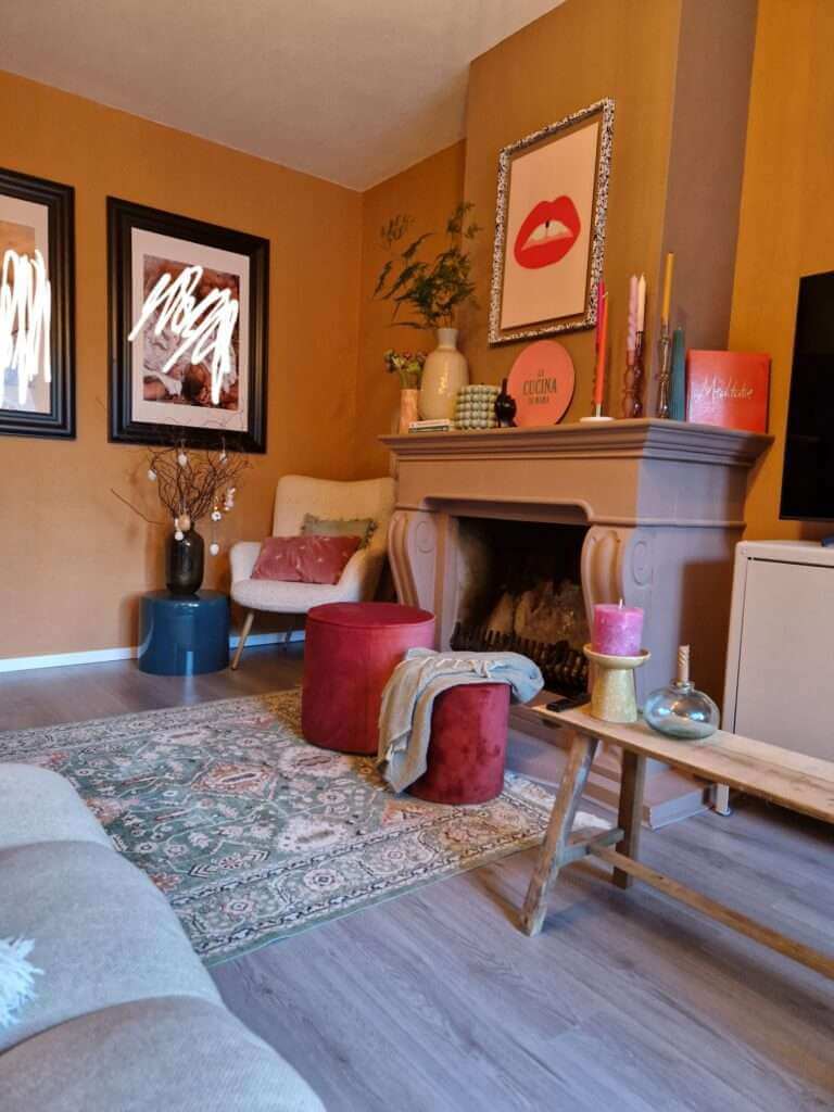 Heerlijke lichte woonkamer met ruimte voor een grote zithoek aan de voorzijde. Hier is tevens de open haard gesitueerd, die naast sfeer ook veel warmte geeft. Via een deur in de kamer kom je in de hal met toilet en trapopgang.