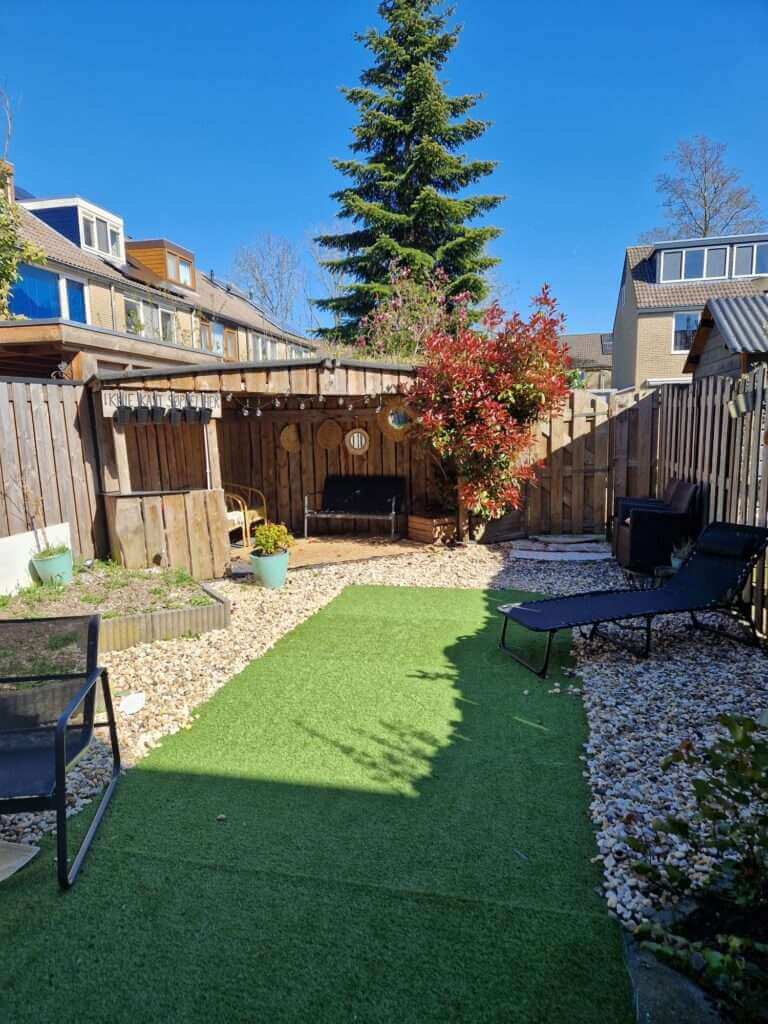Verrassend ruime tussenwoning, verkeersvrij in het groen gelegen, op een perceel van 135 m² eigen grond aan een verkeersluwe straat. De woning heeft een royale woonkamer met openslaande deuren naar de achteruin, half open keuken met inbouwapparatuur, nette badkamer met douchecabine én ligbad, 4 ruime slaapkamers verdeeld over 2 verdiepingen en een diepe achtertuin op het zuidoosten gelegen.