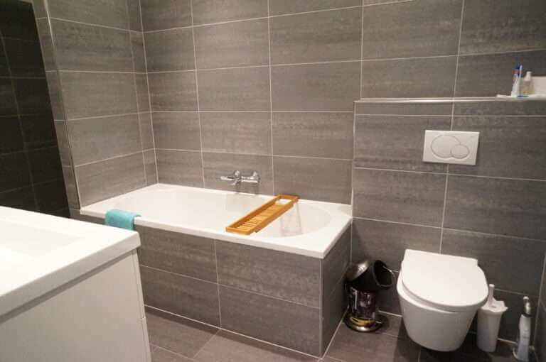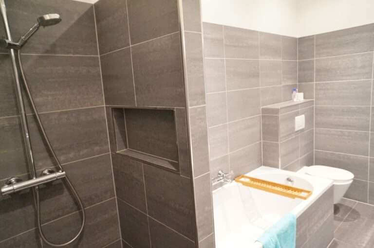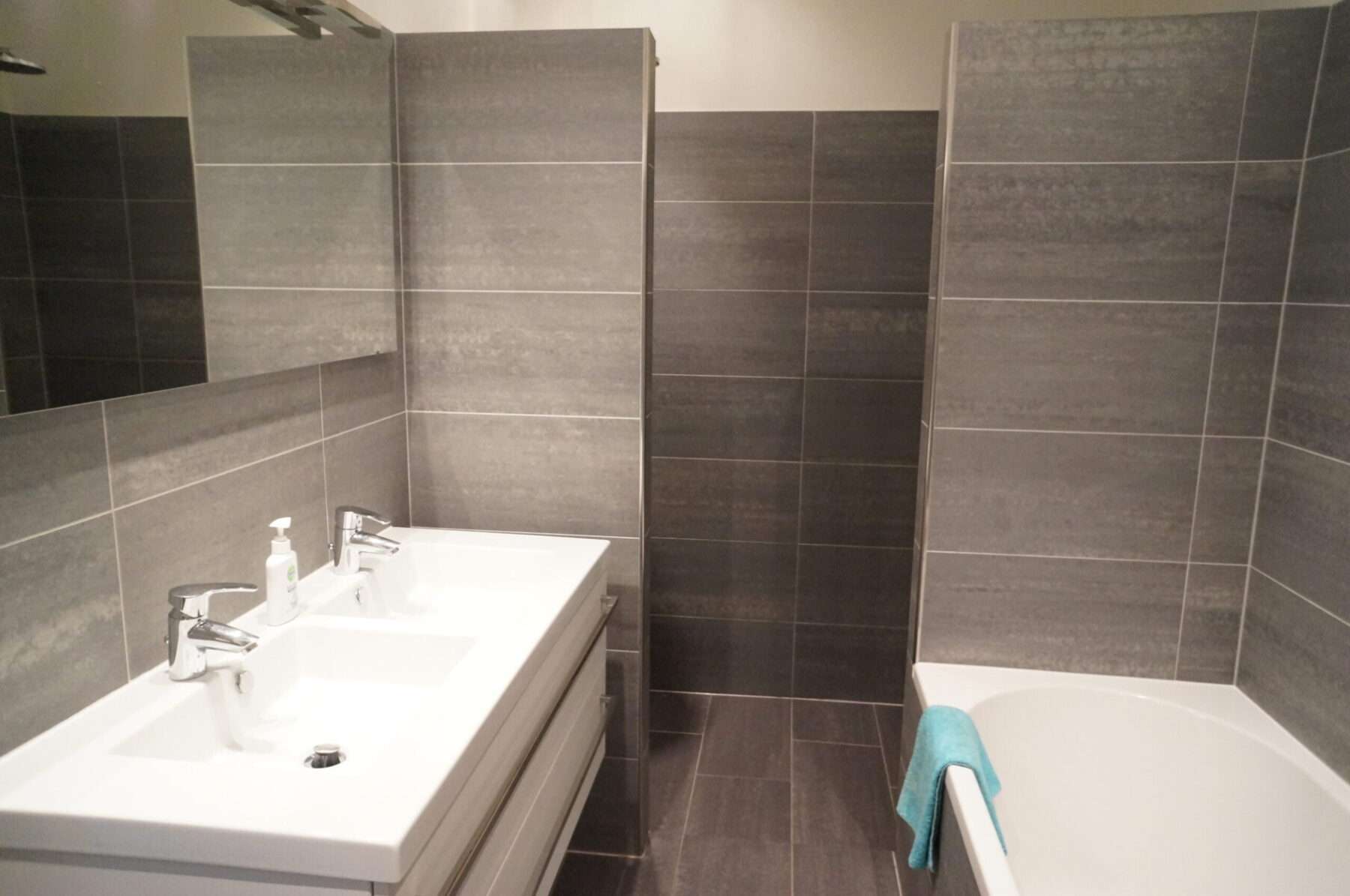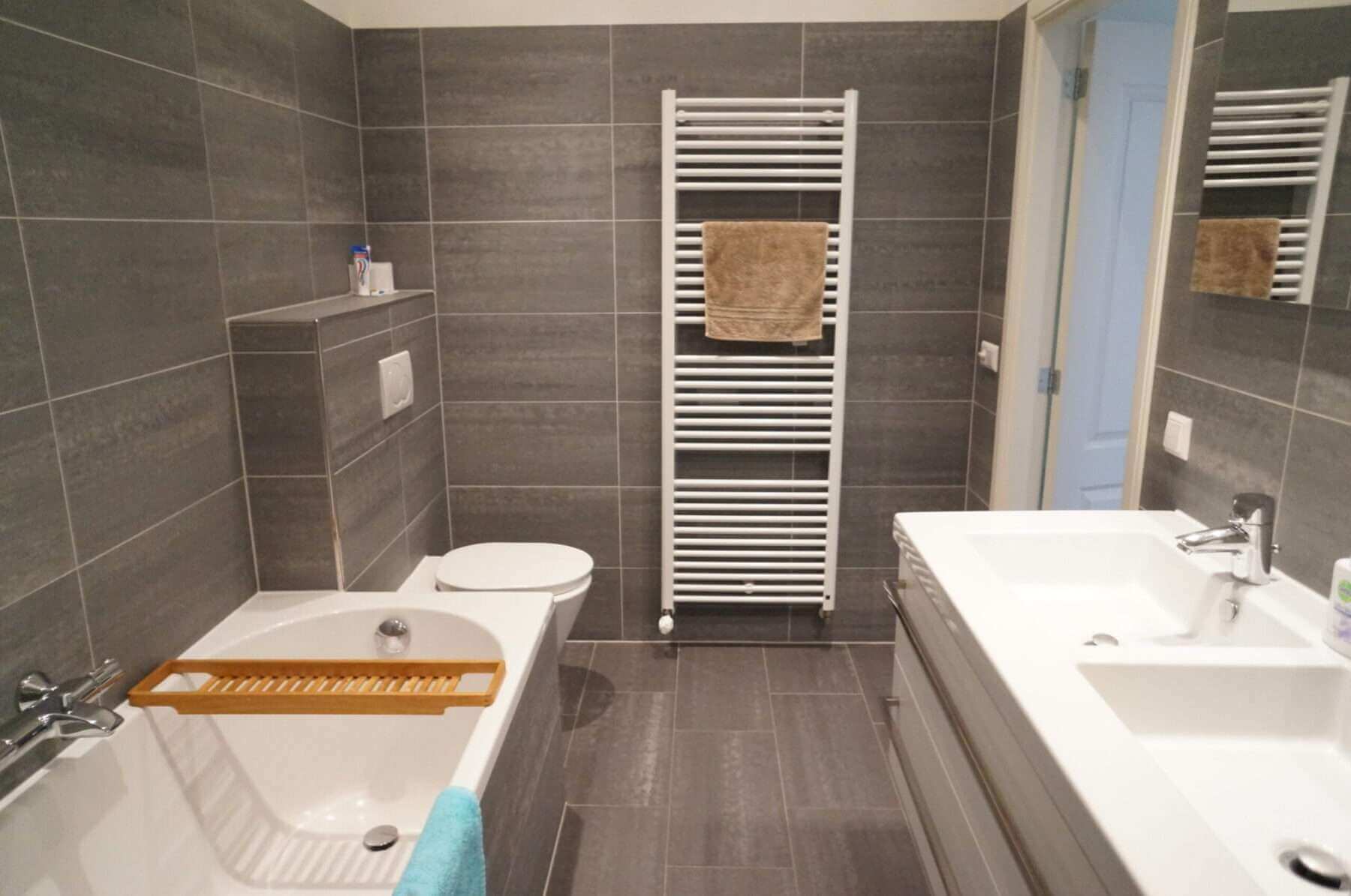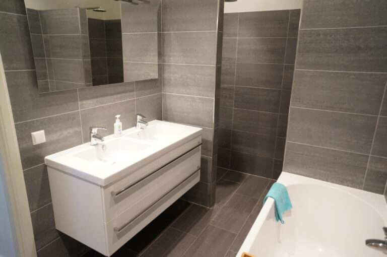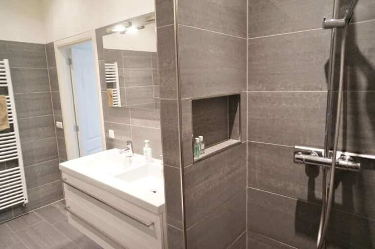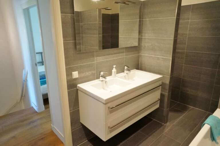 De ruime badkamer beschikt over een dubbele wastafel, ligbad en 2 inloopdouches.